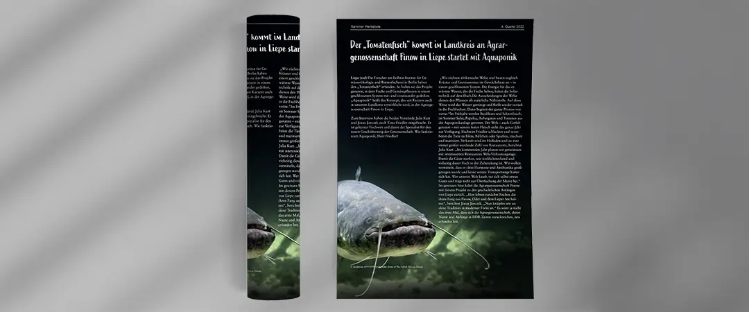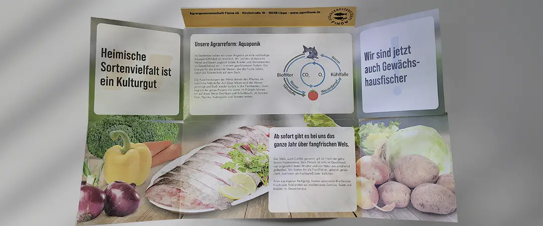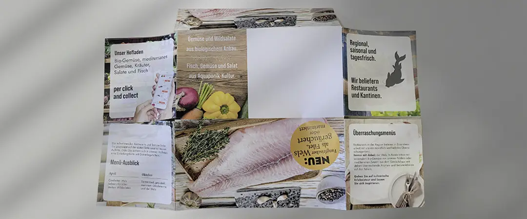 Ein Printmailing zur Kundenansprache im B2B- und B2C-Bereich. Die Gestaltung kombiniert rustikale Elemente mit moderner Typografie und einem klaren Farbkonzept. Der Umschlag, die Innenseiten und das Composing wurden individuell entwickelt. Der Aquaponik-Kreislauf wurde als Vektorgrafik nach Handskizze umgesetzt. Bildmaterial wurde unter Einhaltung der Lizenzbedingungen recherchiert, bearbeitet und eingebunden.